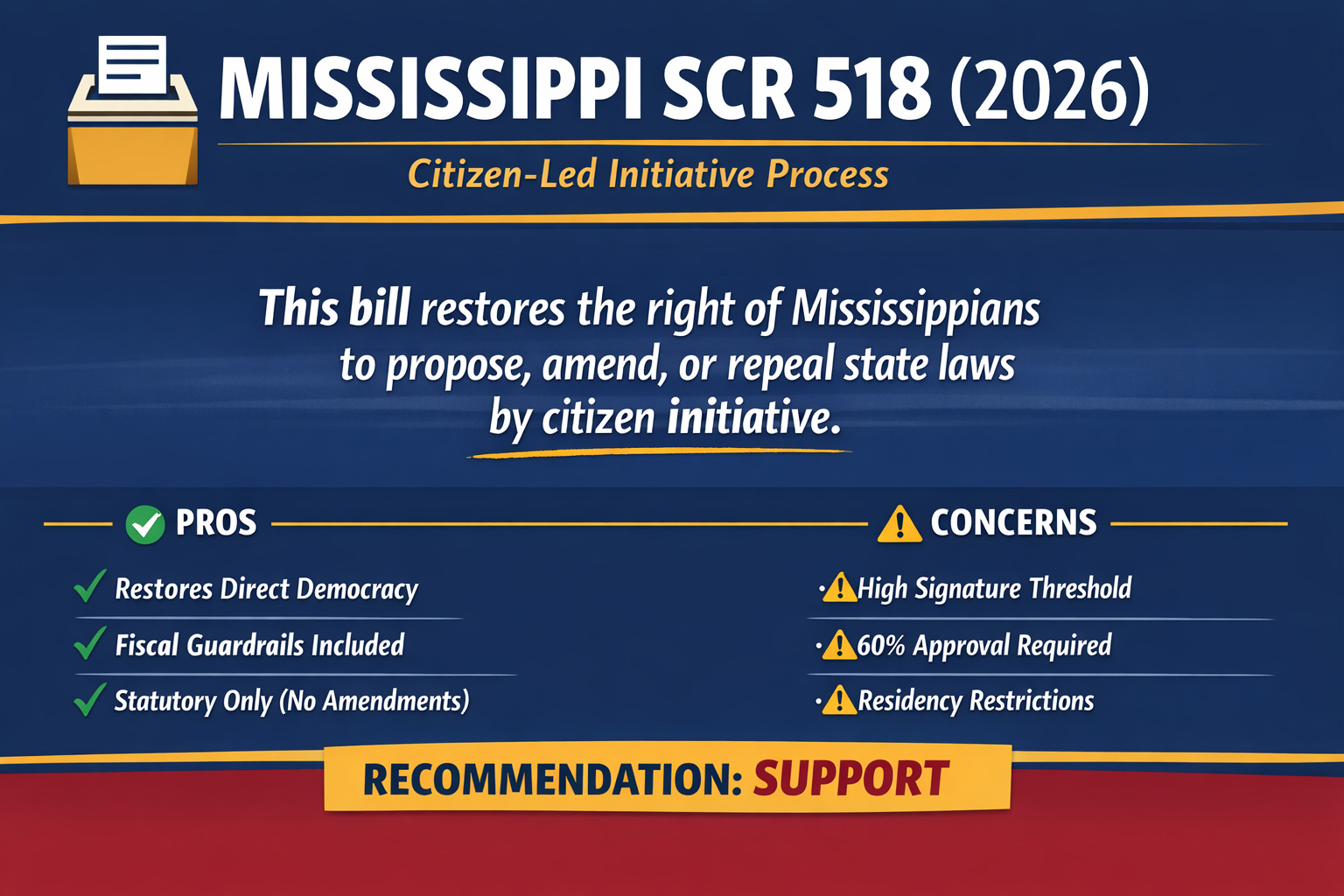 What it changes: Amends Sections 33, 56, 61, and 72 of the MS Constitution to create an initiative process for statutes (not constitutional provisions).
