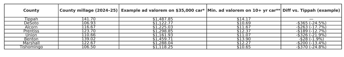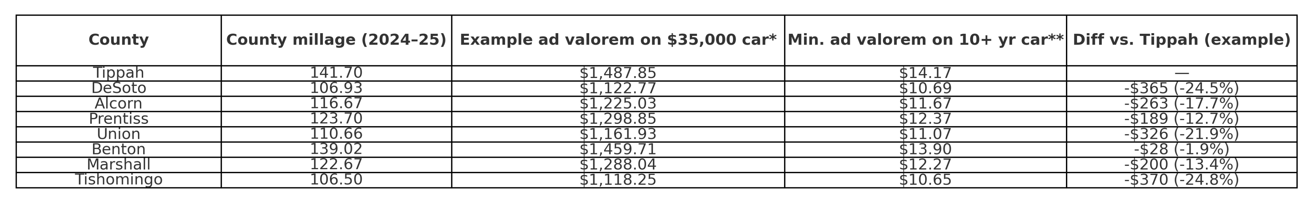Tippah County is one of the higher taxed counties in the region, so for the same car you’ll typically pay 25–33% more than in DeSoto or Tishomingo. Benton is the closest to Tippah (only 2% lower).