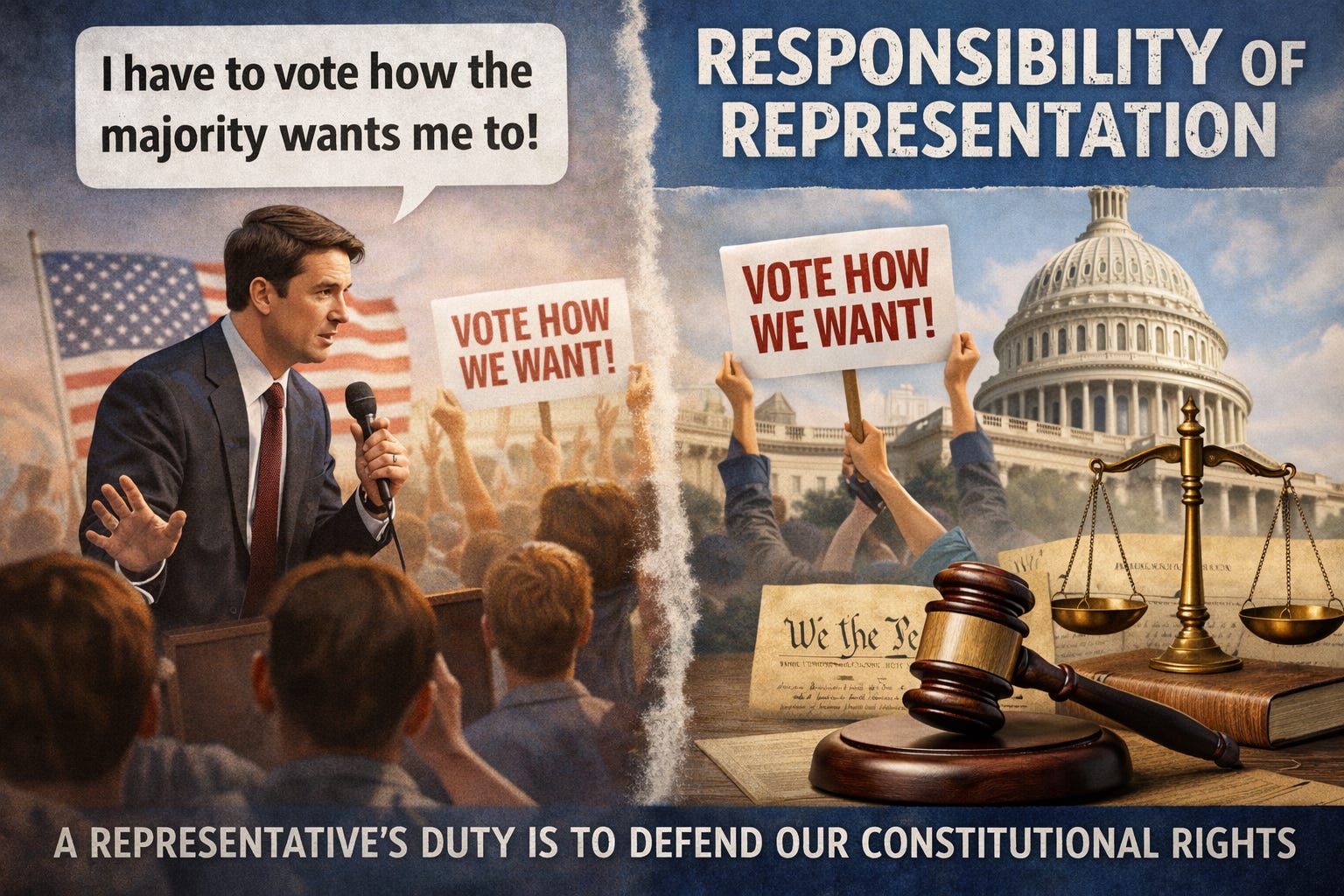If a legislator believes he must vote for any policy his district demands, then constitutional protections become optional. Free speech, due process, property rights, and equal protection all become subject to popular vote. That is precisely what constitutions exist to prevent. Rights are not supposed to hinge on whether they are fashionable or politically convenient.